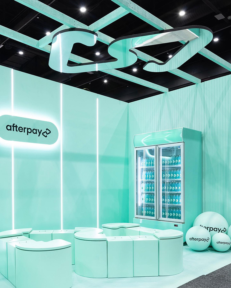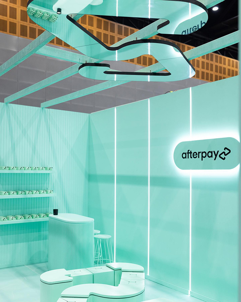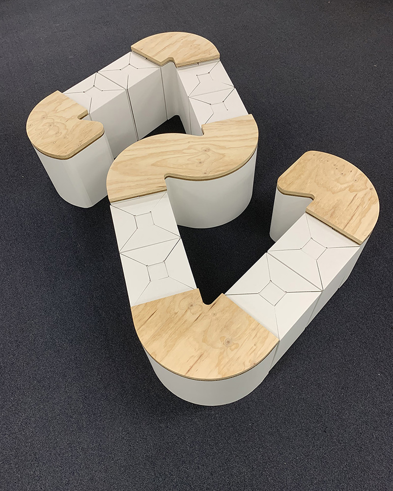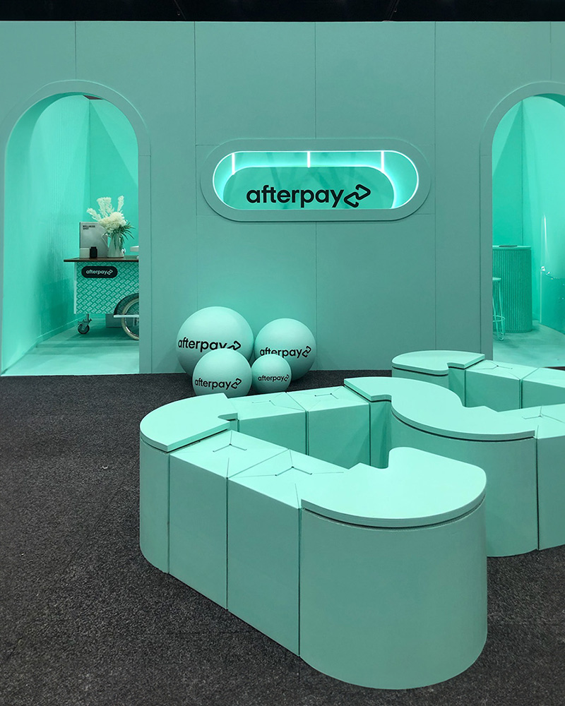 Bianca Gronowski, co-founder and creative director at Ten Hats Agency, approached Fold Theory to create a custom “Loop Love Seat” for their client Afterpay – built to reflect the logo, travel between events, and be as recyclable as possible. To balance mobility with durability, we designed it in two parts: heavy, immovable tables made from stacked laminated cardboard, and lightweight stools made from folded cardboard, ideal for quick reconfiguration across venues. This modular system simplified both logistics and installation. The Loop Love Seat debuted at Australian Healthcare Week at ICC Sydney, then travelled to Retail Global at the Gold Coast Convention and Exhibition Centre, and later returned to ICC Sydney for the Online Retailer expo.