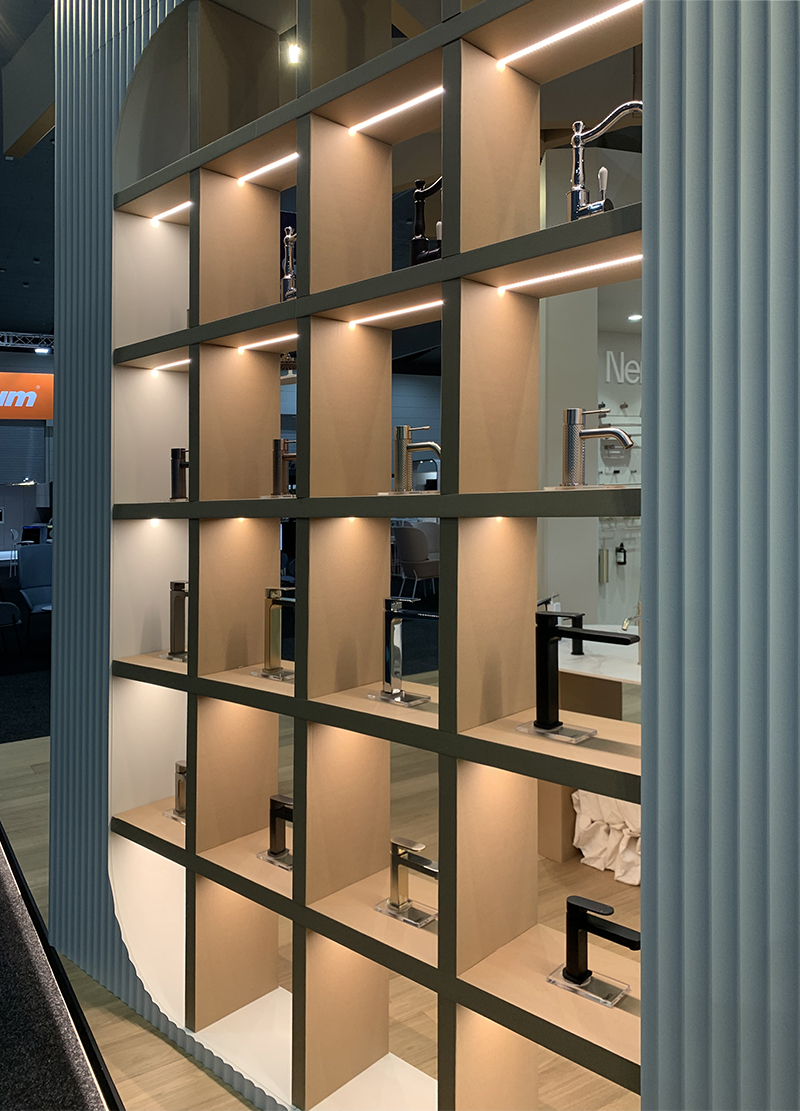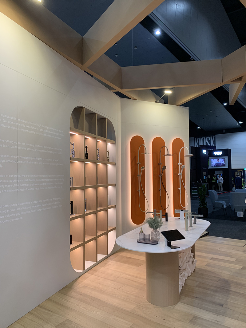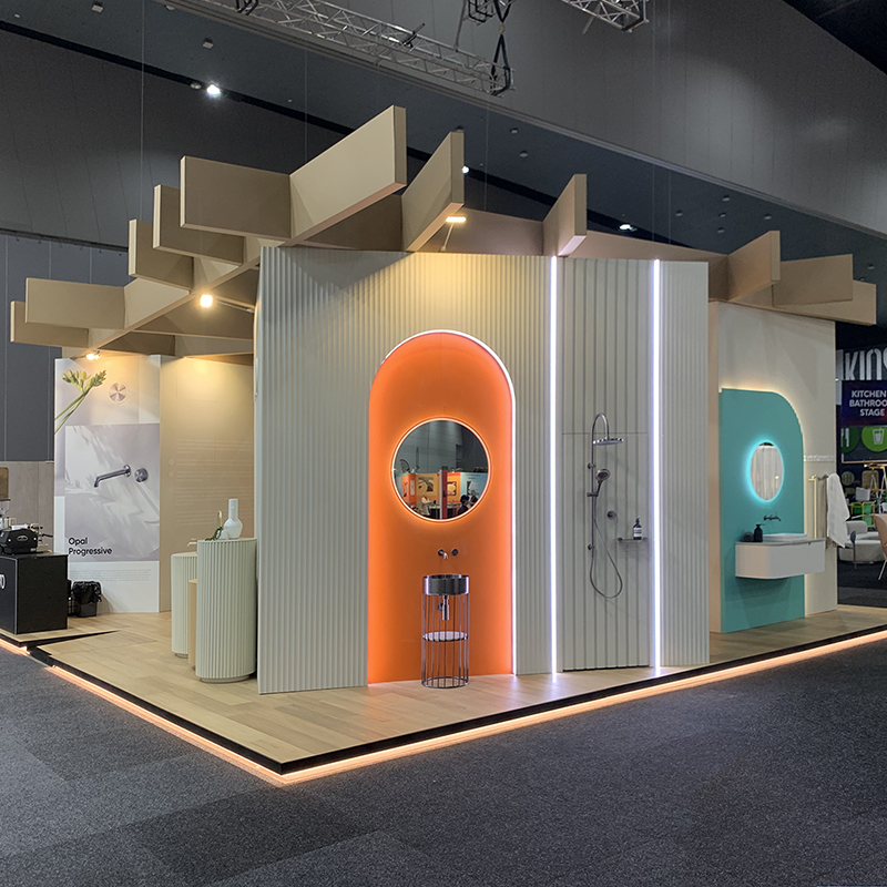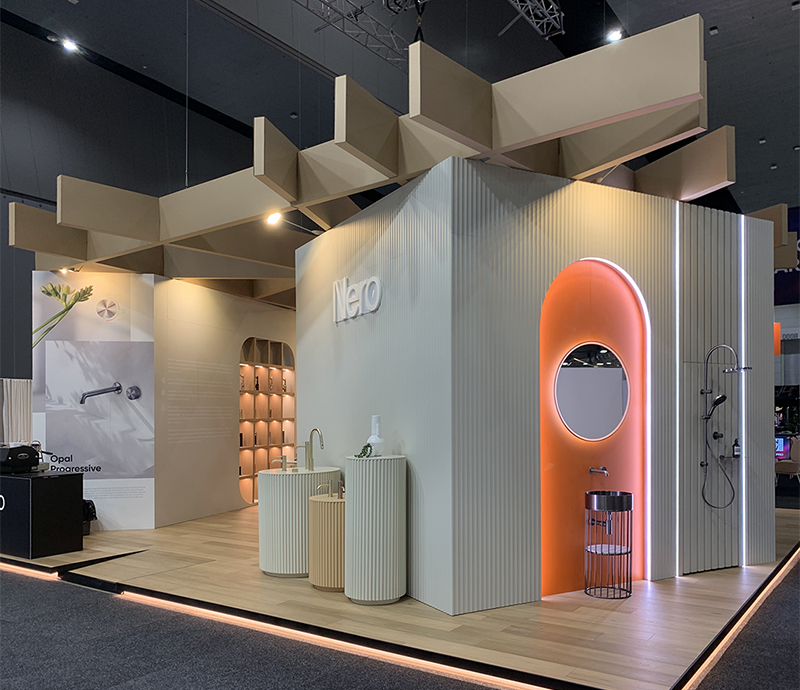 Nero Tapware commissioned Fold Theory to engineer and construct a nine-by-nine-metre ceiling from cardboard. Their in-house designer developed a complex geometry that, at this scale, would have been prohibitively heavy and costly if made from timber. Fold Theory crafted the ceiling beams by folding 3mm corrugated cardboard – lightweight and assembled without glue. The beams were prefabricated in parts and delivered by truck, then slotted together on the floor before being hoisted into the air for 48 hours while Harry the Hirer built the rest of the stand below. Finally, the ceiling was carefully lowered into place atop the walls. Fold Theory also provided recyclable cardboard shelving and table legs, creating a sustainable contrast to the otherwise conventional materials used. Nero subsequently commissioned Fold Theory to design and construct their next trade show stand predominantly from cardboard.