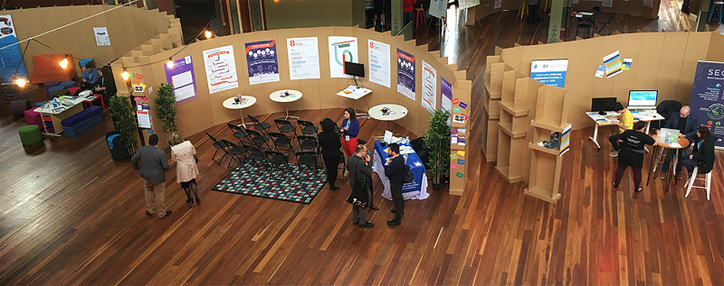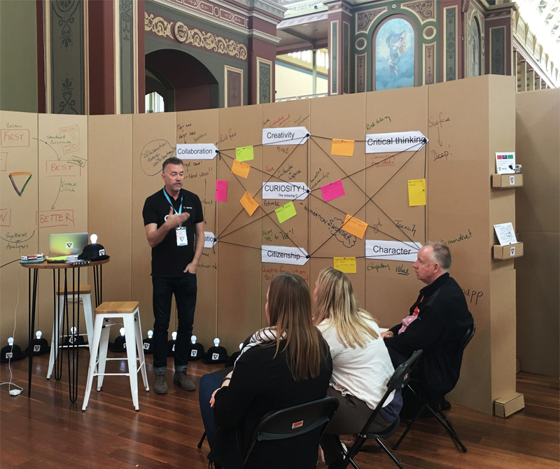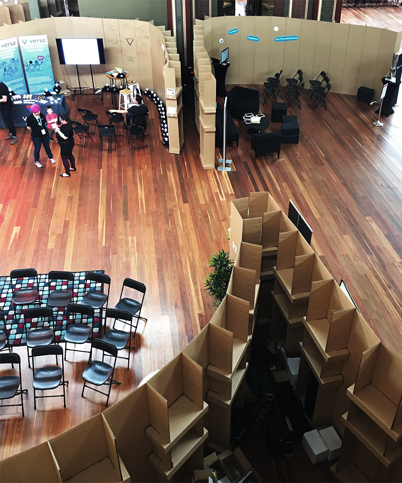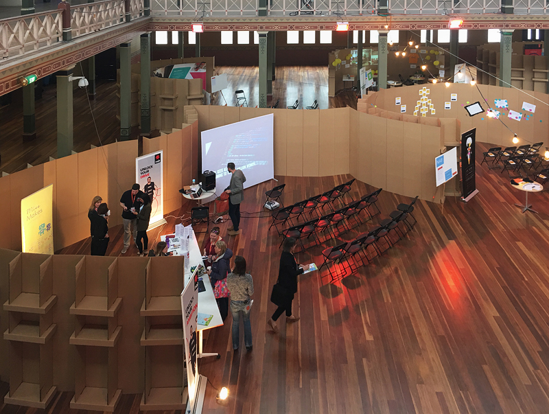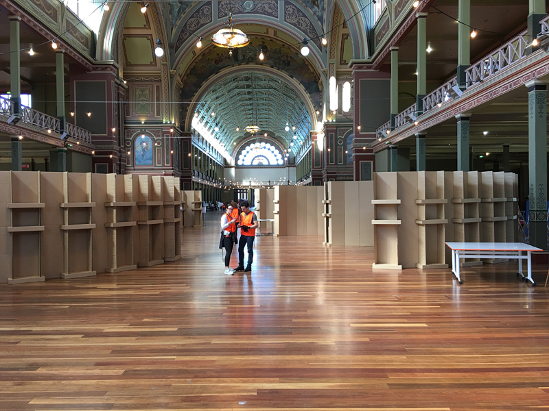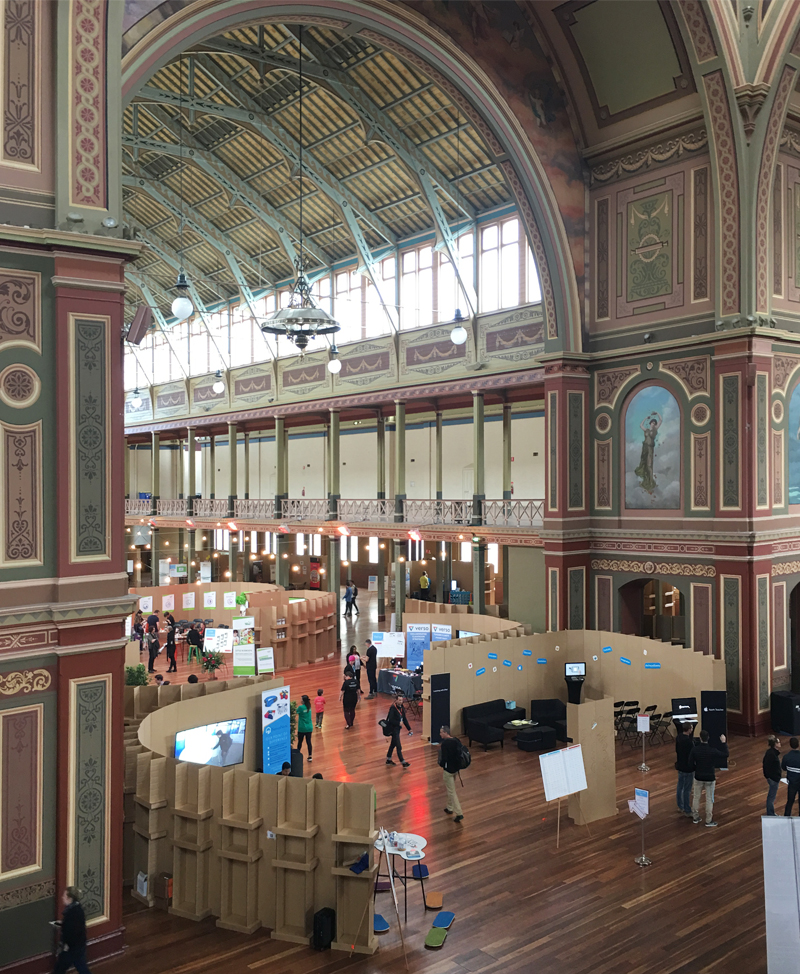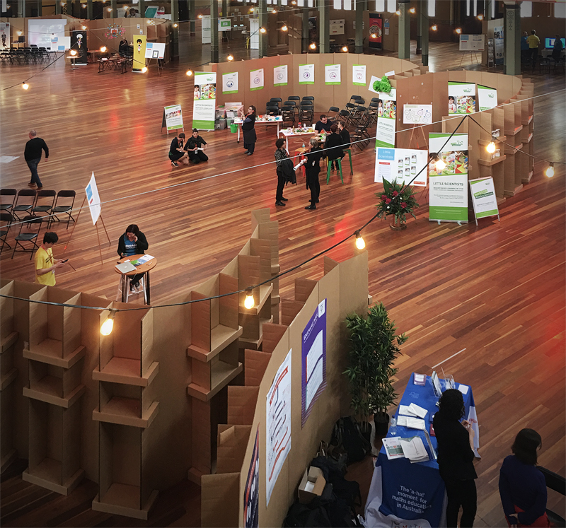 Education Changemakers commissioned Fold Theory to plan the layout and provide the exhibitor booth walling for a very large educational conference. Filling the majority of the Royal Exhibition Centre, the sheer size of the project meant that the system had to be quick and simple to install. The cardboard walls were flexible and could be curved to suit each stall holder’s needs.