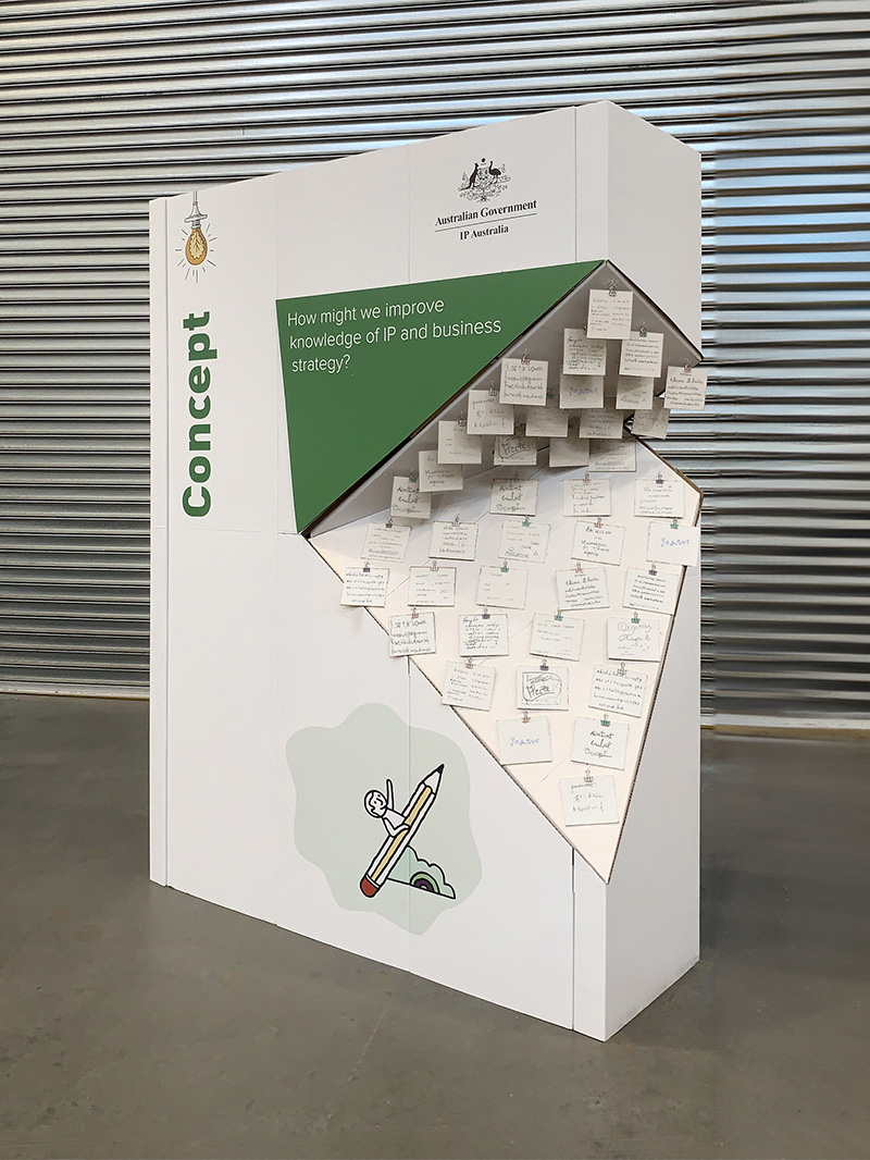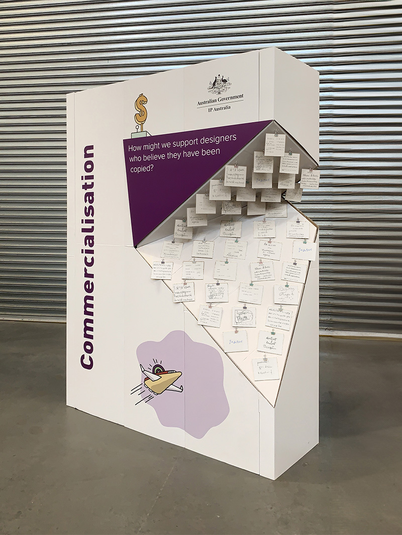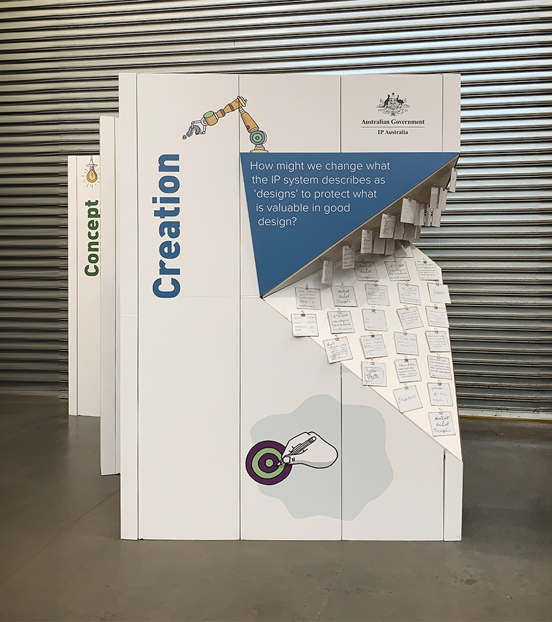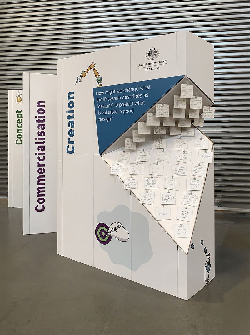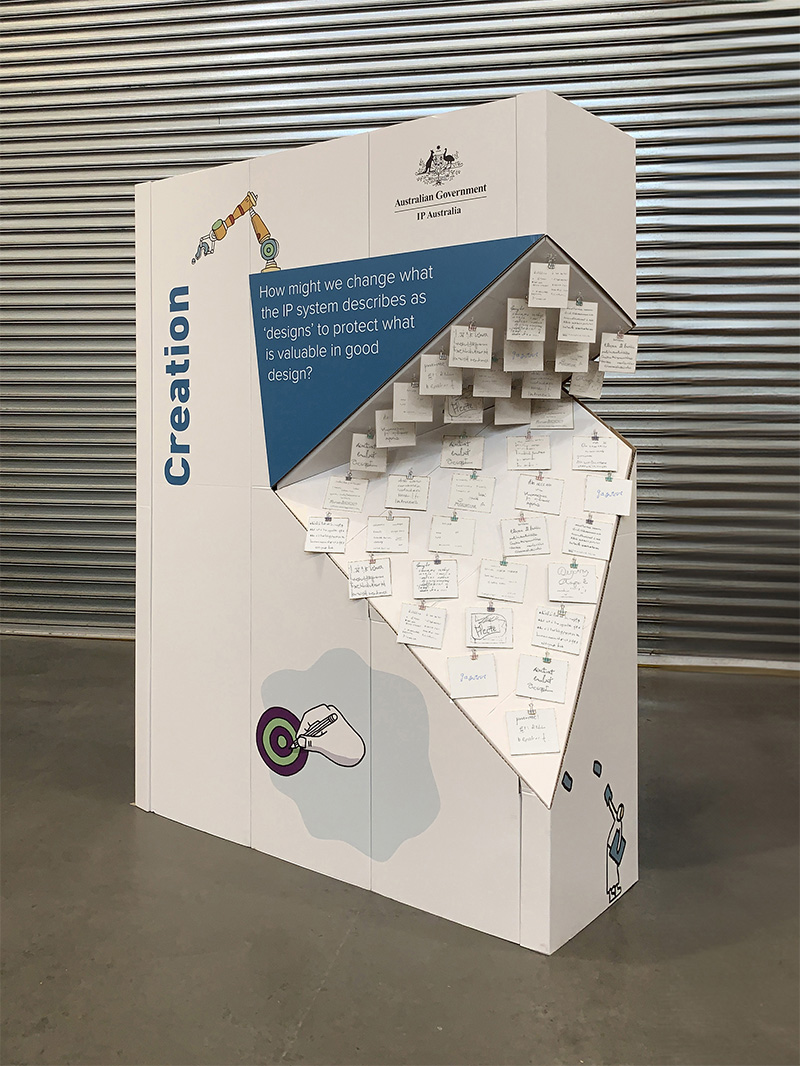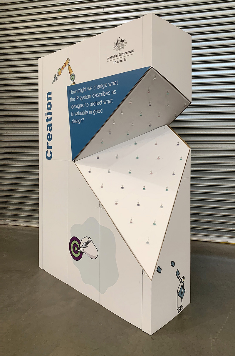 IP Australia worked with Fold Theory to produce a set of three interactive objects for workshop participants to share their responses to three key questions about intellectual property in design. Entitled “Visualising Australia’s design economy” the workshop was part of the Melbourne Design Week 2020 programme. Unfortunately, the physical event was cancelled at the last minute due to the onset of the COVID 19 pandemic.