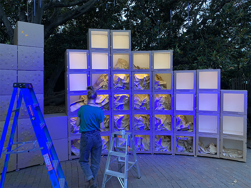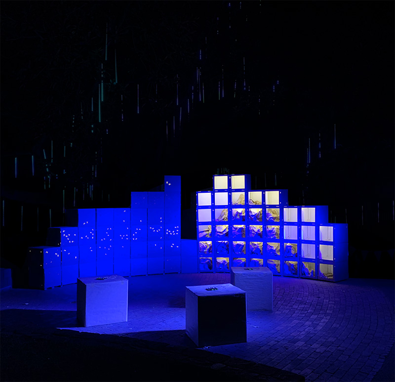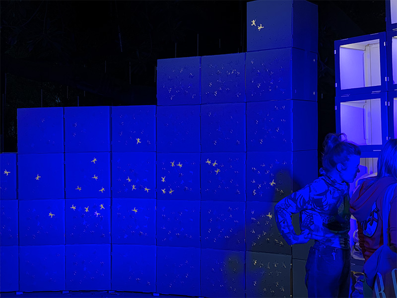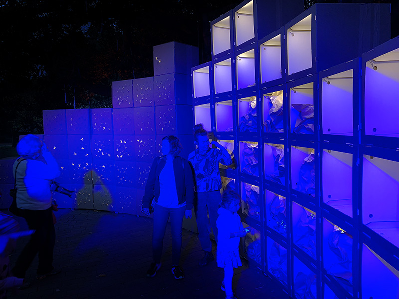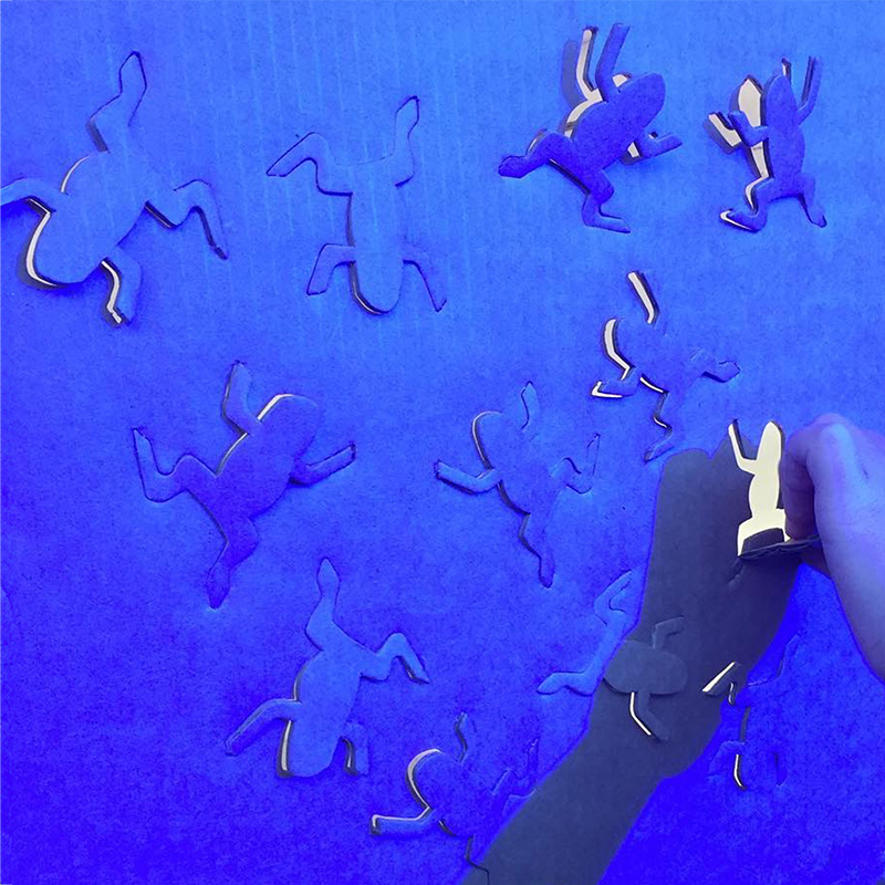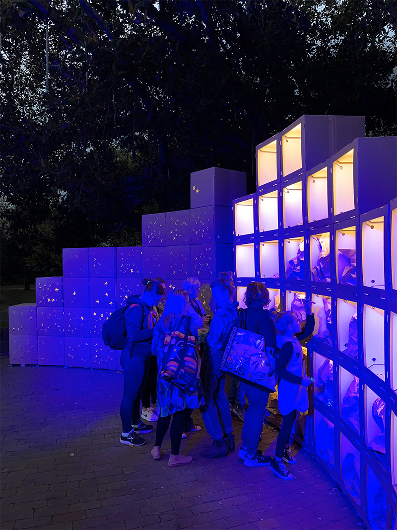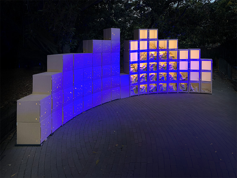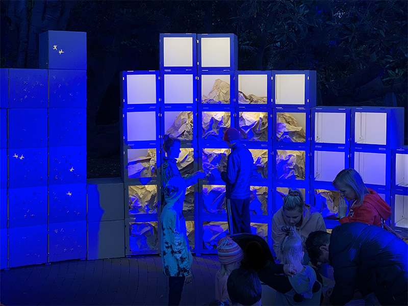 Mt Frogiusko was an outdoor interactive light and sound installation designed by artist Lara Tumak in collaboration with Fold Theory, located at Melbourne Zoo as part of a two week long after-dark festival called Neon Playground. At Mt Frogiusko, visitors explored the story of the critically endangered corroboree frog that is found only in Kosciuszko National Park, through a hands-on activity and visually interactive experience. Participants collected a blank cardboard frog from the illuminated ‘incubators’, then decorated it before placing it on the paper mountain, all the while immersed in the sounds of amplified field recordings of the corroboree frog. Commissioned by Zoos Victoria in consultation with amphibian specialist Damian Godall, with lighting by Paul Lim.