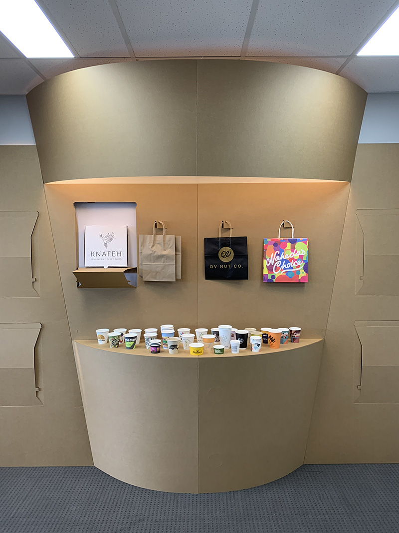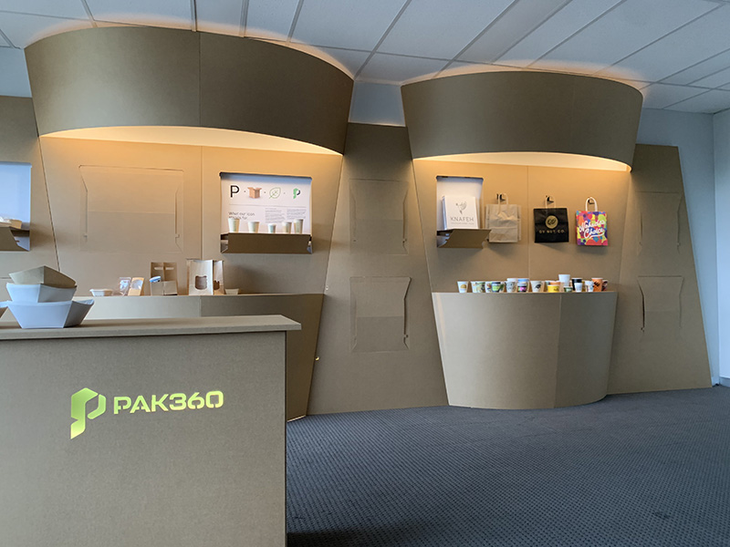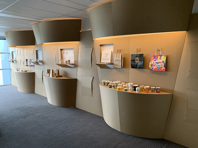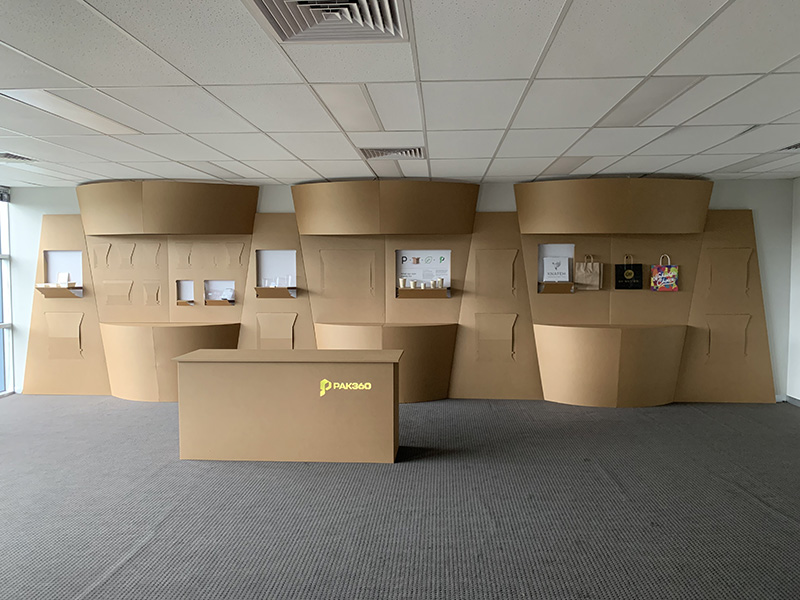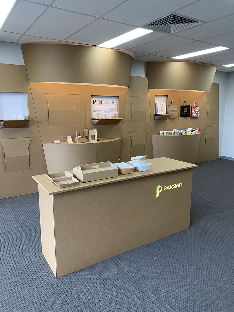 When designing a showroom for a company that sells environmentally friendly disposable hospitality packaging, the visual pun was irresistible. Paper packaging supported on paper shelving. Giant paper cups. Fun times. PAK360’s CEO Addo Armani’s favourite architect is Zaha Hadid. In our first briefing meeting he highlighted work in the Fold Theory portfolio that had curves in it. “Can I have curves?” “Yes.” The result is post modern (pop?) reference of the supersized commodity, less Hadid and more Gehry.