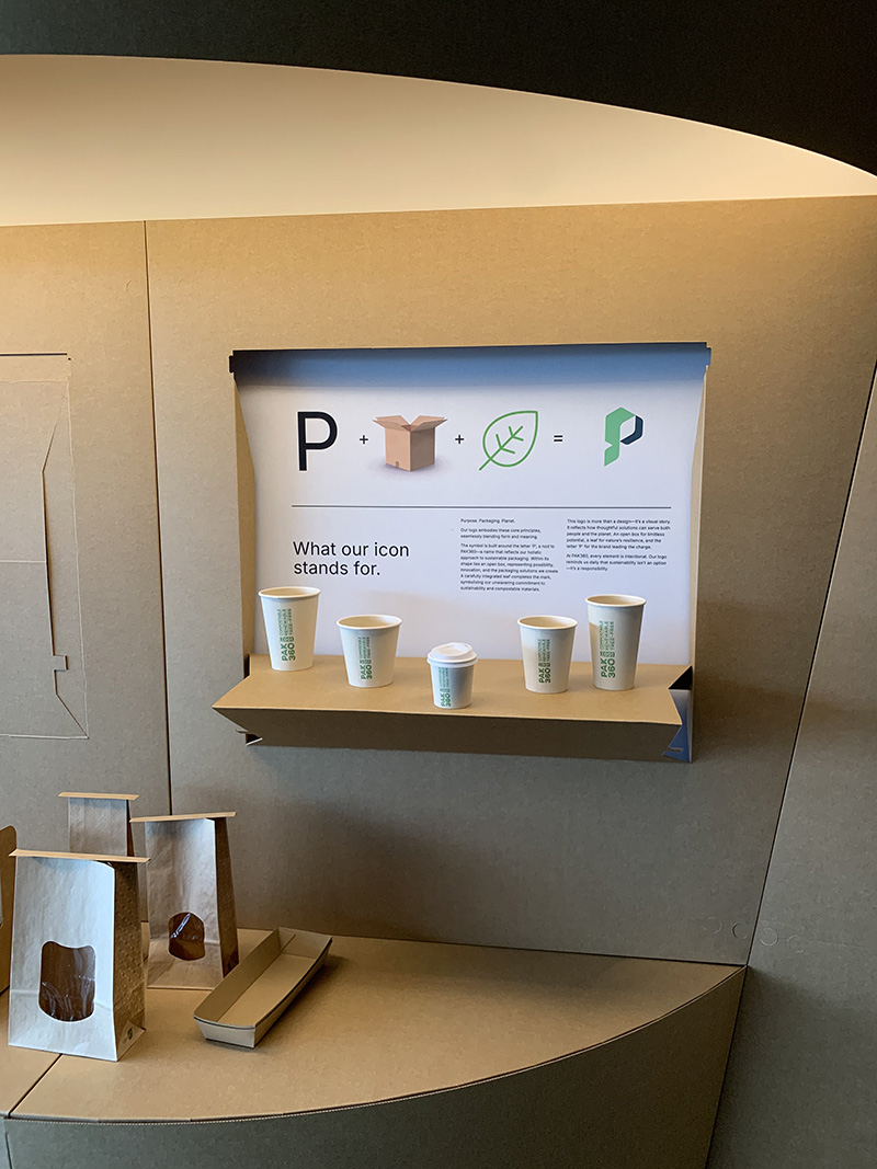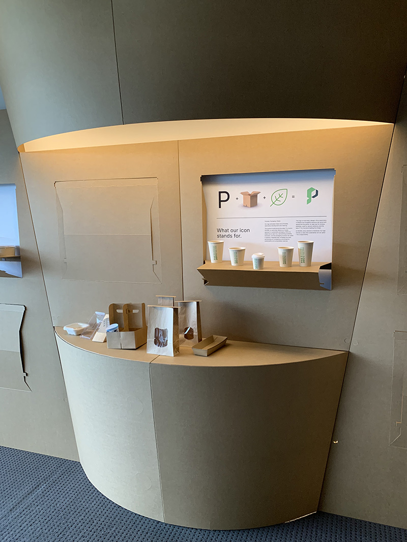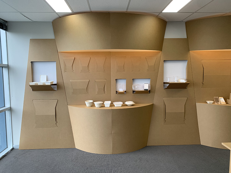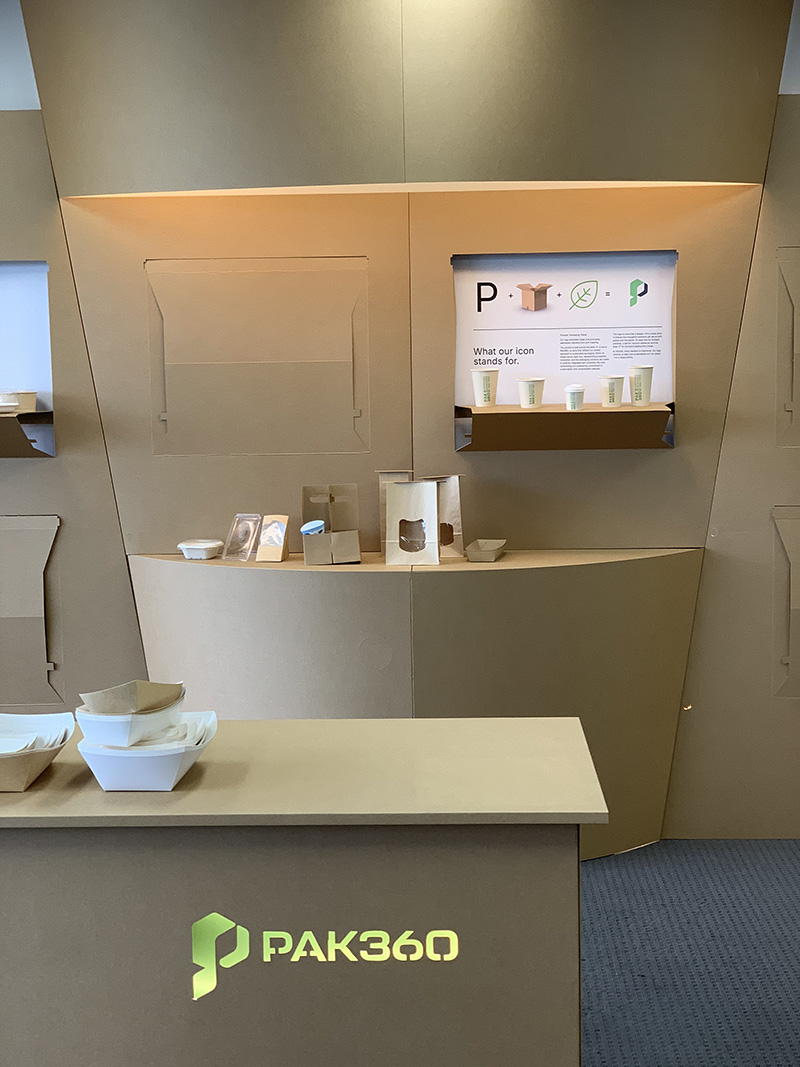 When designing a showroom for a company that sells environmentally friendly disposable hospitality packaging, the visual pun was irresistible. Paper packaging supported on paper shelving. Giant paper cups. Fun times. PAK360’s CEO Addo Armani’s favourite architect is Zaha Hadid. In our first briefing meeting he highlighted work in the Fold Theory portfolio that had curves in it. “Can I have curves?” “Yes.” The result is post modern (pop?) reference of the supersized commodity, less Hadid and more Gehry.